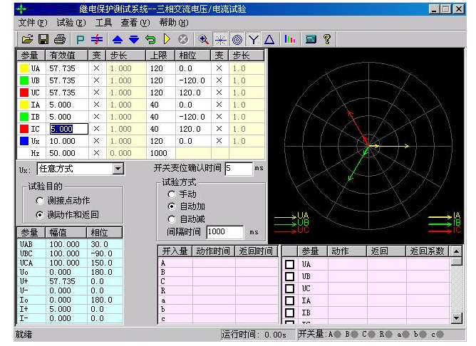 YTC1000微機(jī)繼電保護(hù)測試儀單欄中常用的菜單項,在各個測試模塊中其名稱或符號相同,定義的意義和功能也基本相同。這里以“交流試驗”模塊為例進(jìn)行介紹,可以適用于后面介紹的各個功能模塊。界面如下圖所示: