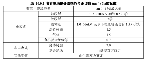 2.應在分閘狀態下測量每只套管的 tanδ 。當測得值超過標準時,應卸下油箱后進行分解試驗,此時測得的套管的 tanδ (%)值,應符合本標準表 16.0.3 的規定。