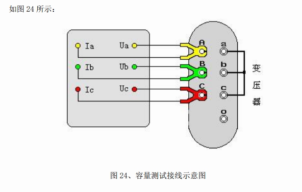 容量測試儀配有三把測試鉗(黃、綠、紅),每只鉗子分別引出兩根測試線,一根粗線、一根細線,粗線接到儀器面板上容量測試端子對應顏色的電流端子(Ia、Ib、Ic),細線接到儀器面板上容量測試端子對應顏色的電壓端子(Ua、Ub、Uc),將鉗頭按顏色分別夾在被試變壓器的高壓側(cè)各相接線柱上,變壓器的低壓側(cè)要用專用短接線良好短接。