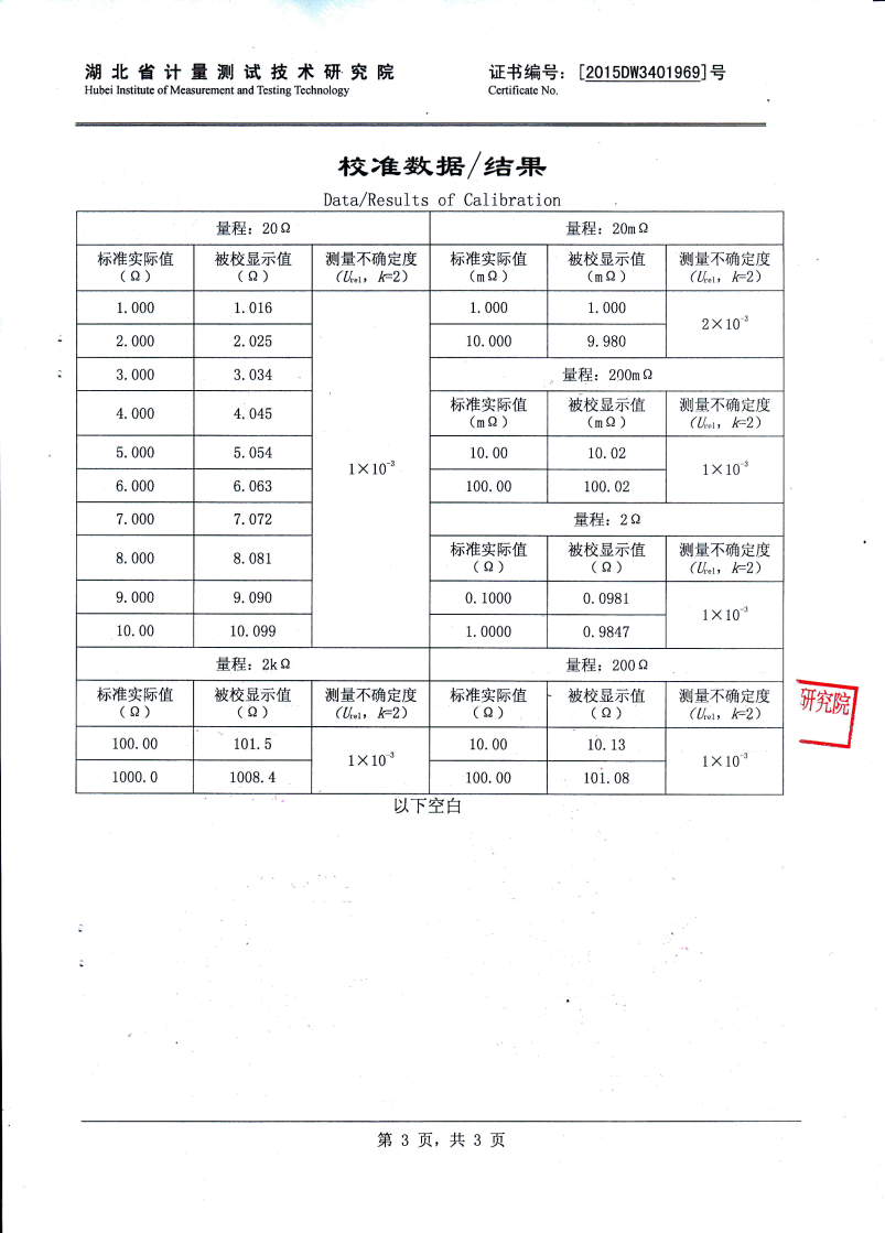 3A(1μΩ~20mΩ、20 mΩ~200mΩ、0.2Ω~2Ω); 300mA(2Ω~20Ω); 15mA(20Ω~200Ω); 1.5mA(200Ω~2kΩ); 150uA(2kΩ~20kΩ); |