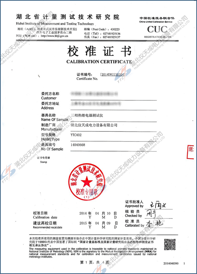 YTC402三相熱繼電器測(cè)試儀鑒定證書(shū)