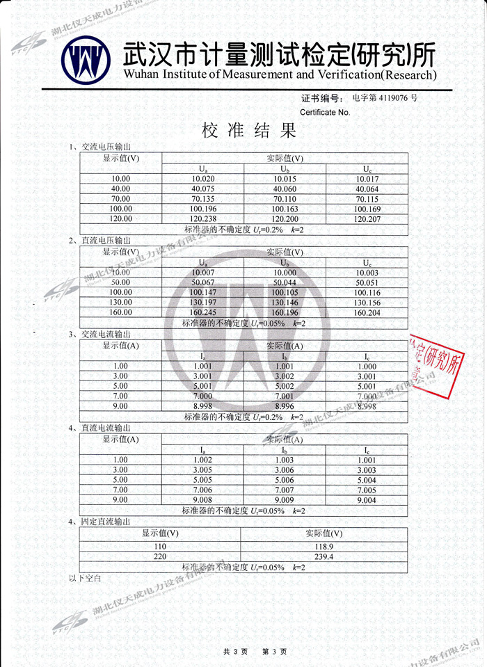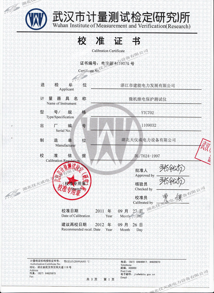 轉載:"YTC702微機繼電保護測試儀的資質證書" 請注明來源于儀天成電力。 更多技術問題請致電儀天成電力客戶服務:027-87876585,技術部專線:027-87876585,在線客服:719388481