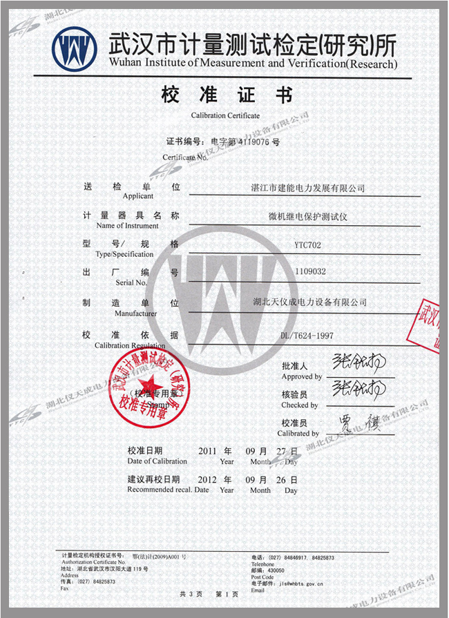 YTC702微機(jī)繼電保護(hù)測試儀鑒定證書