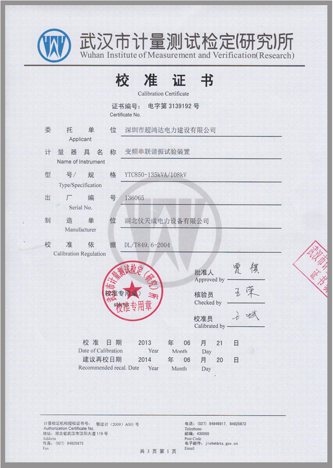 YTC850系列電纜交流耐壓試驗(yàn)裝置鑒定證書(shū)